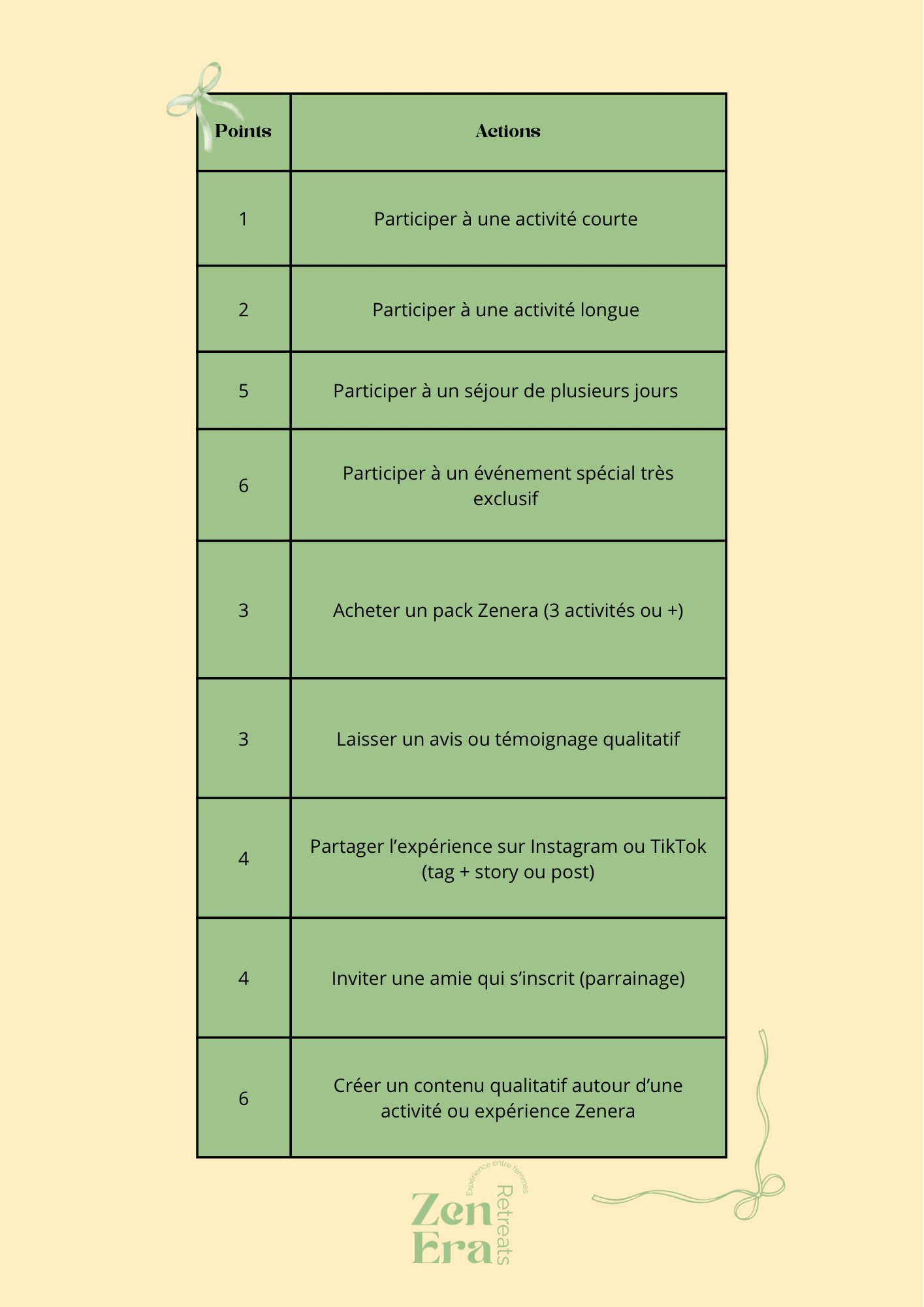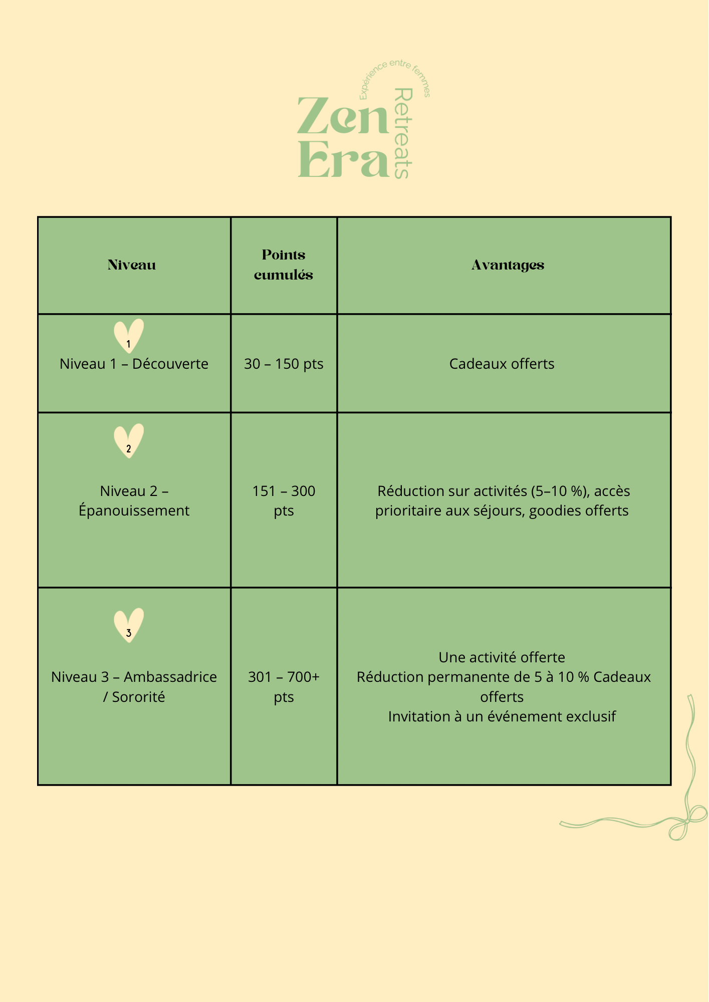 Bienvenue dans le Zenera Club, le programme de fidélité pour les femmes qui aiment les activités bien-être entre filles. Cumulez des points à chaque expérience, atelier ou événement, et bénéficiez d’avantages exclusifs, cadeaux et invitations à des événements uniques. Découvrez votre tableau de points et niveaux, et commencez à profiter dès maintenant des récompenses du Zenera Club !